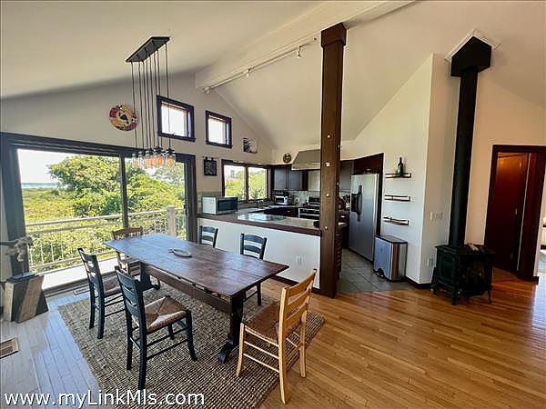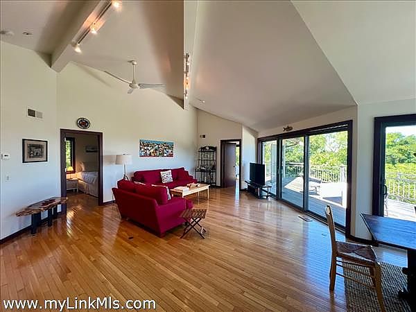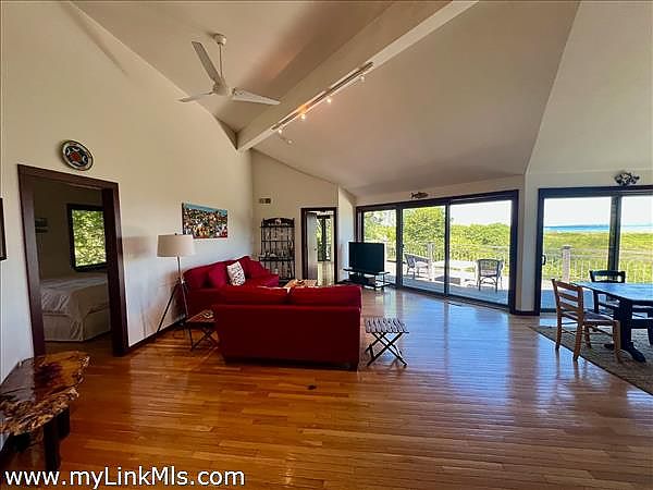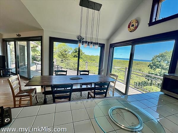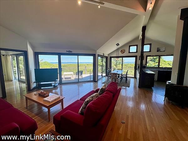 Spacious contemporary set high off Lighthouse Road with unobstructed, amazing water views of the Vineyard Sound and Elizabeth Islands. Open concept design with soaring ceilings and modern architecture. A retreat for all seasons this house is fully insulated, heated and has central air. A center island in the kitchen ensures the cook of the family does not miss out on the amazing sunsets. Ground level offers family room and gym space or just nice getaway with privacy. Access to Philbin Beach, Lobsterville Beach and all the perks of Aquinnah residency.