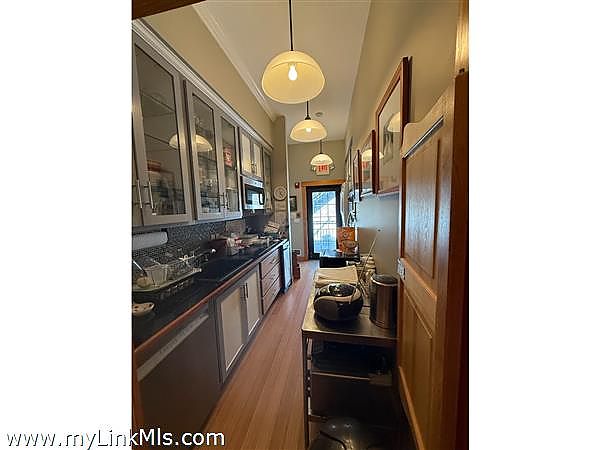 This mixed use building is zoned for residential and commercial use. It is extremely well built with an emphasis on non-toxic materials throughout. High ceilings on all three levels. There are radiant floors mixed with forced hot air/AC. The building offers a variety of uses for a new owner. The existing spaces are very versatile and would be ideal for any service oriented business given the multiple office spaces and a large open room for perhaps physical therapy or treatment space. There is a galley kitchen and two full baths on the main floor as well as three offices (one could be considered a first-floor bedroom), and a large open room with doors out to the parking area. Upstairs, there is a two-bedroom apartment with a full bath, a full kitchen with wood cabinets, and a living room with a fireplace. In addition to the finished apartment, there is a separate space framed and insulated with generous square footage to easily expand the living space or bedroom capacity in the second-floor apartment. The property supports four bedrooms. The basement has high ceilings with steel beam construction. There is a wide, full-height access to the lawn from the basement. This space could be renovated to serve as an additional workspace or living space.