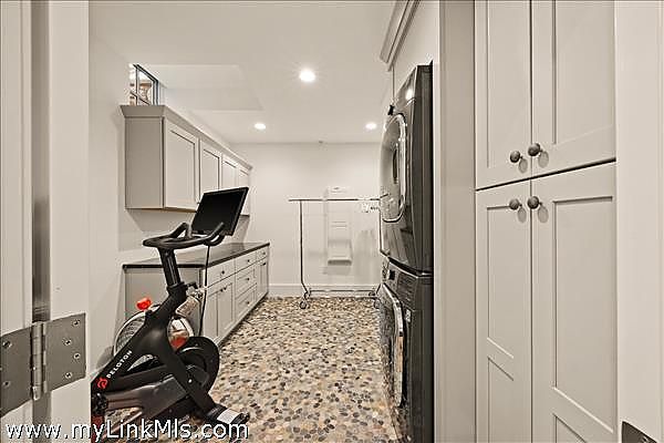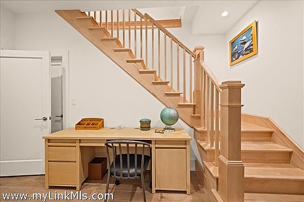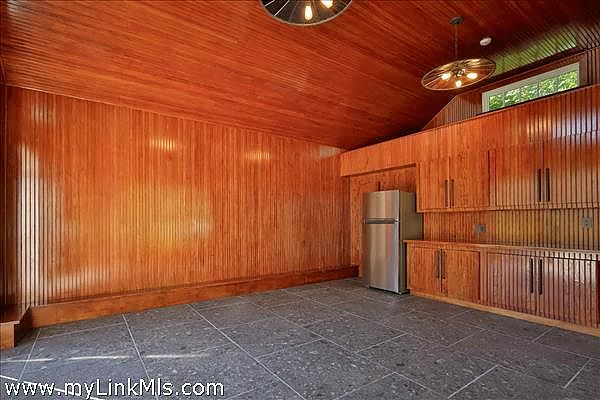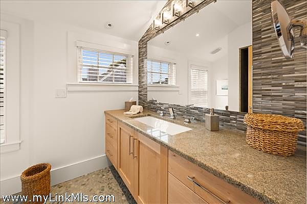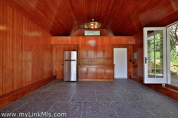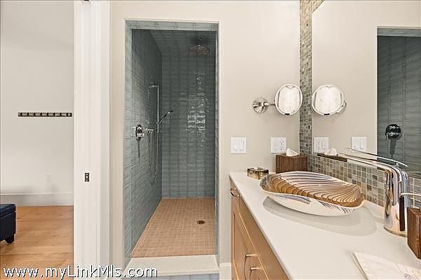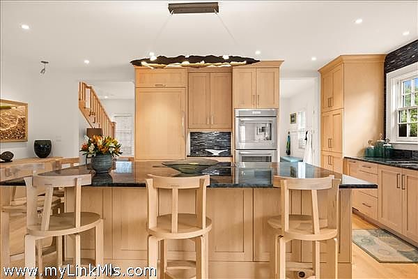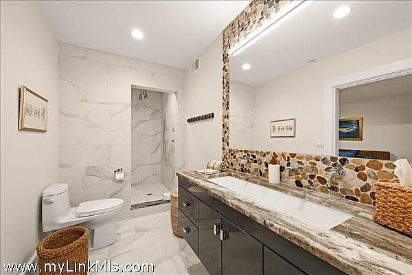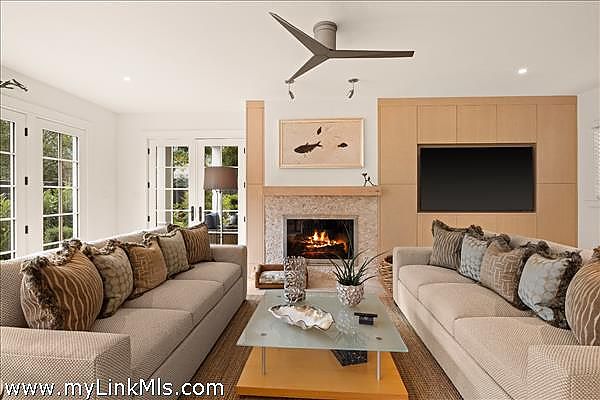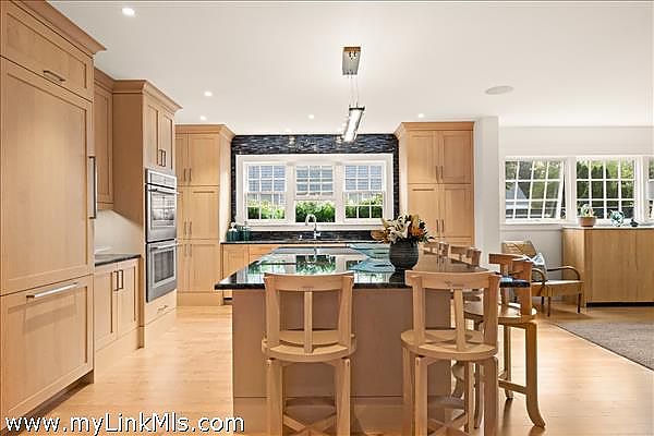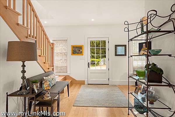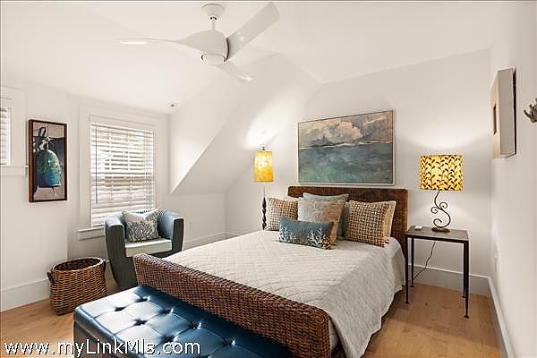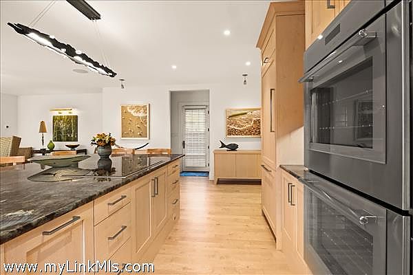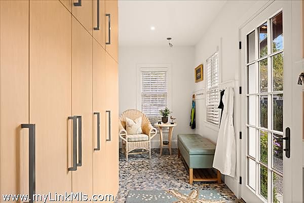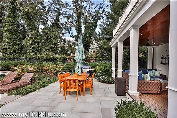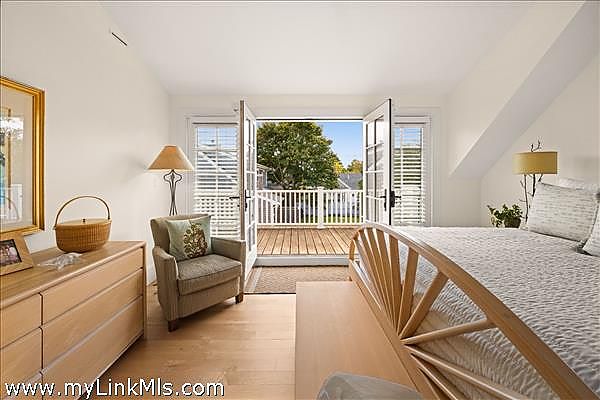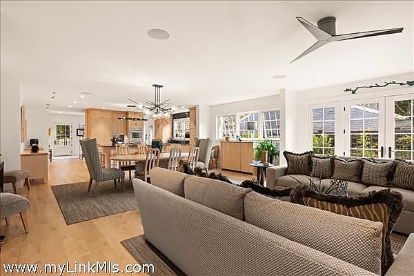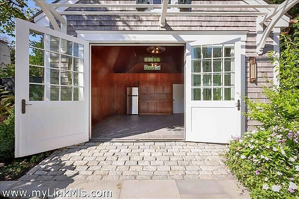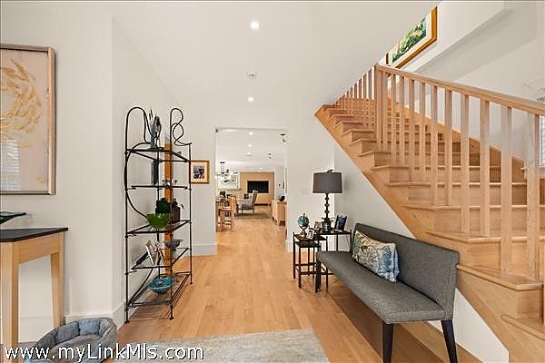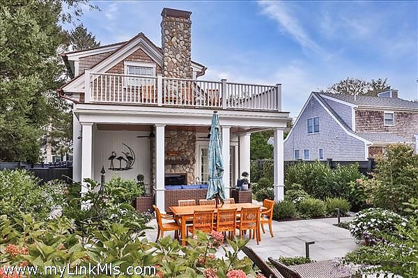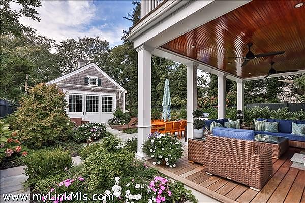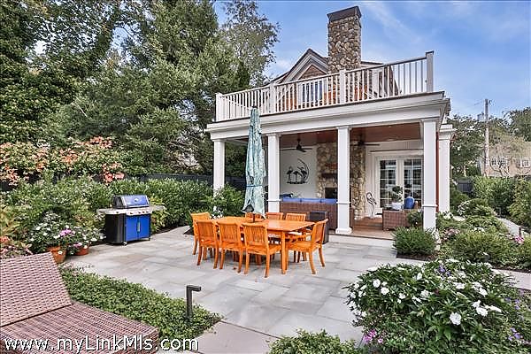 This Greek Revival style home blends timeless architecture with a bright, modern open floor plan, all presented in impeccable condition. A welcoming front foyer leads into a beautifully appointed kitchen featuring high-end appliances, a large center island, and seamless flow into the dining and living areas. The living room is anchored by a fireplace and filled with natural light throughout. French doors open to a covered porch with a striking stone fireplace, overlooking a meticulously landscaped backyard with multiple patios—perfect for outdoor entertaining. Upstairs, the second floor offers a spacious primary suite complete with a private sundeck, along with two additional ensuite bedrooms and laundry room. The finished lower level adds exceptional versatility, featuring two additional bedrooms, comfortable sitting area with TV and a generously sized laundry space. A detached barn at the rear of the property includes a full basement and bathroom, as well as a large deck—ideal for a variety of uses. Additional highlights include two outdoor showers and parking for up to four cars. All of this is set on a quiet street just blocks from the vibrant downtown Historic District.