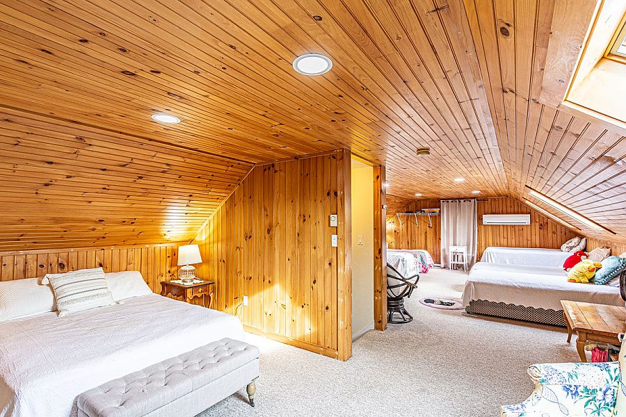 The main living level hosts a living room, family/TV room, large and very well equipped kitchen with breakfast bar, and a dining area that opens to a deck with additional dining space and grilling area overlooking the back yard nicely bordered by trees and shrubs. The 2nd level of the house has a Primary Bedroom en-suite and two lovely guest bedrooms. The third spacious level of the house is perfect for children and teens with three beds to the left at the top of the stairs. The right side has a not quite fully private queen bedroom.