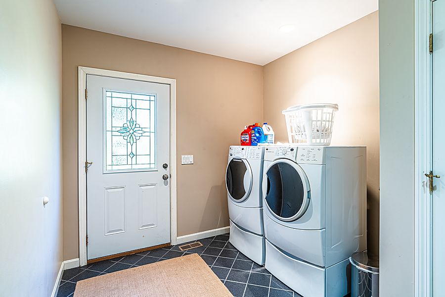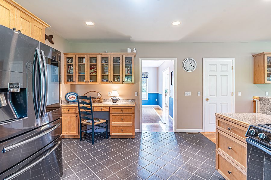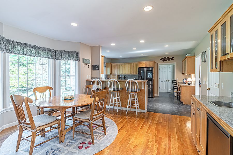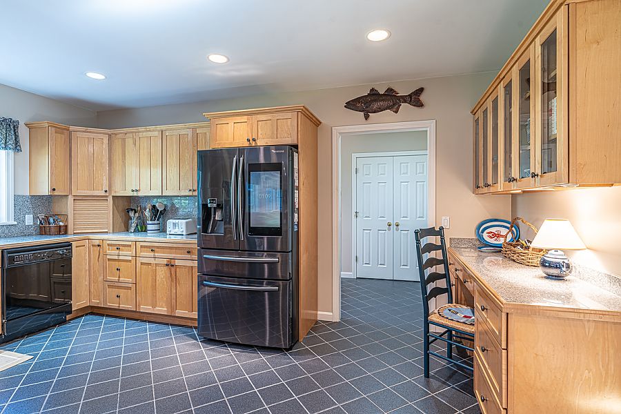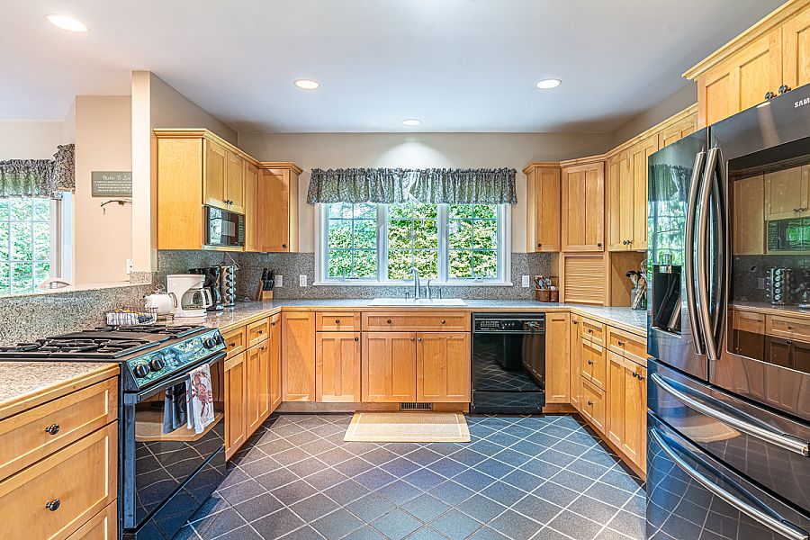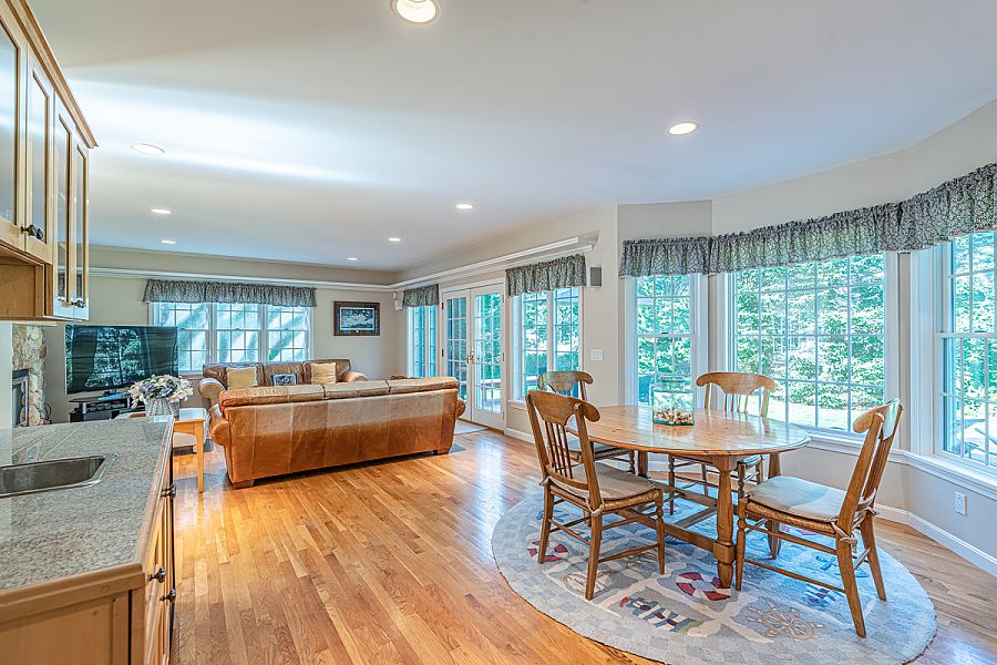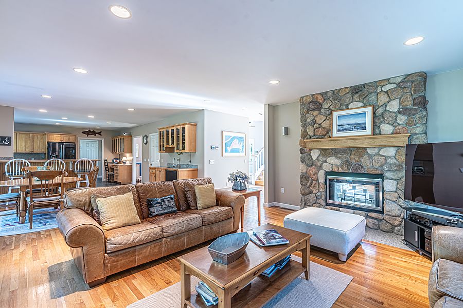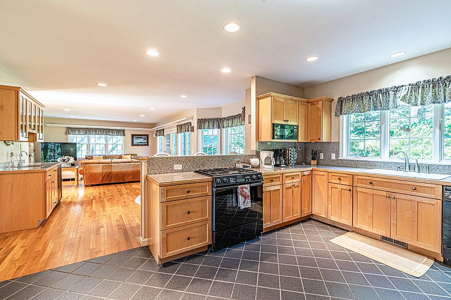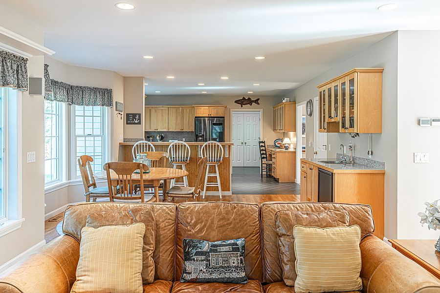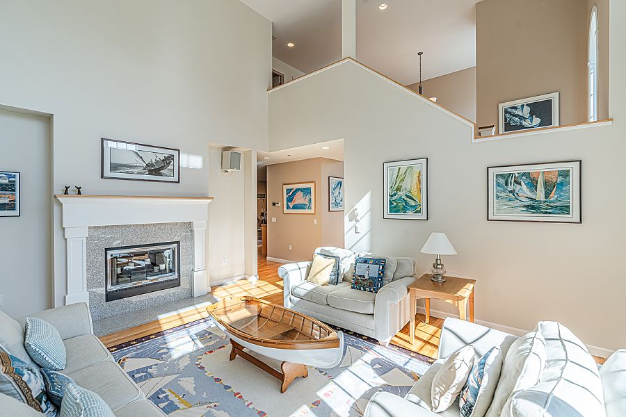 An open floor plan combines the large kitchen, dining room, media area, and a comfortable formal sitting room, all with access to the sunny, privately situated deck.